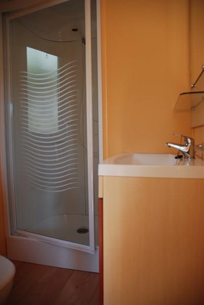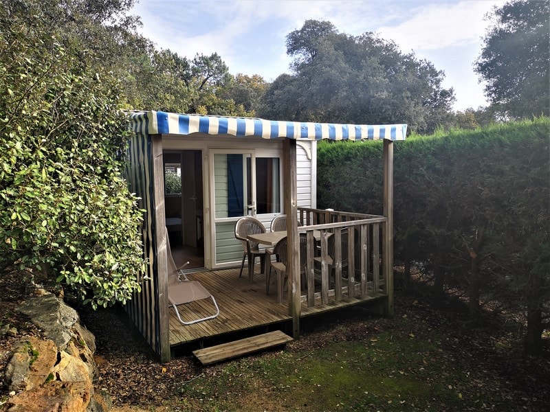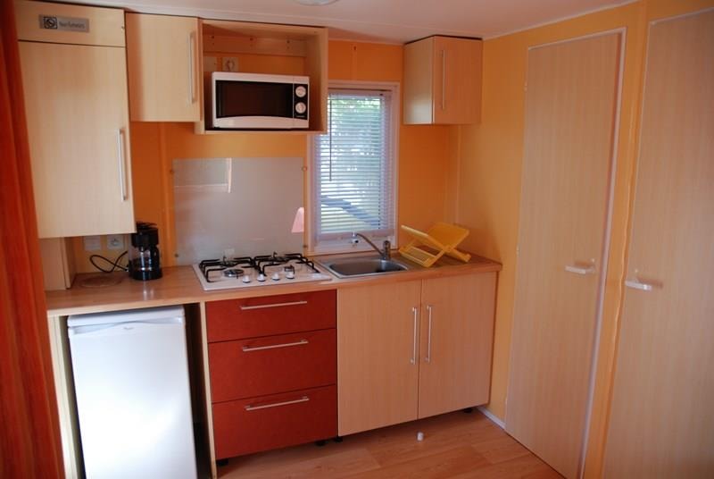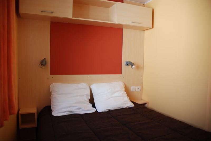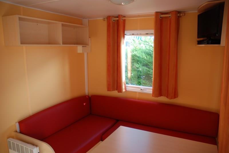 Mobil-home récent comprenant une chambre avec 1 lit 2 personnes, un couchage convertible 1 personne dans le salon, une salle de bains avec lavabo, douche et WC, une cuisine équipée avec réfrigérateur, micro-ondes, cafetière électrique, TV, une terrasse couverte avec salon de jardin.