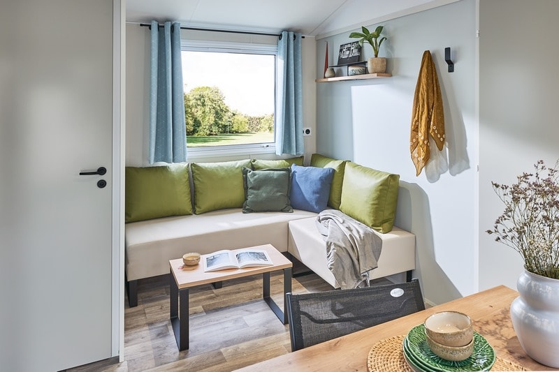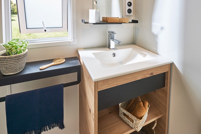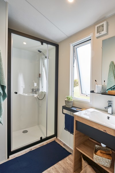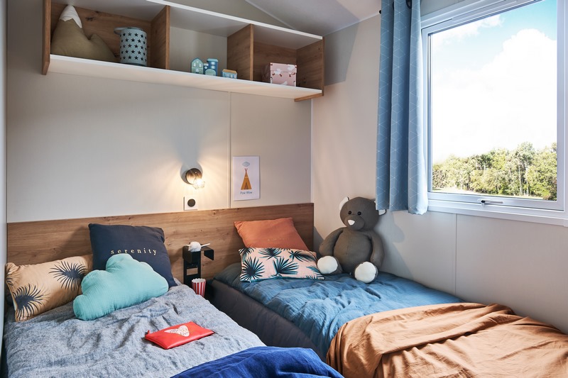 Nouveauté 2023 : Ce mobil-home comprend une chambre lit double, une chambre avec 2 lits simples, un espace de vie central avec banquette, table et cuisine équipée avec grand réfrigérateur/congélateur, TV avec réception satellite, SDB avec lavabo et douche, WC séparé, terrasse couverte avec table et fauteuils, transats.