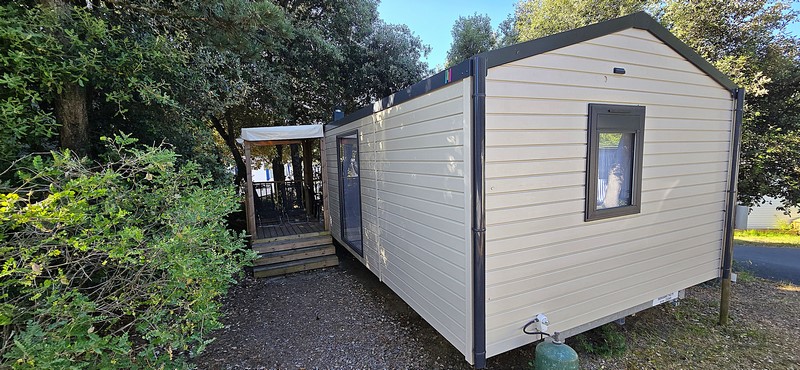 Modèles 2023 et 2026 : Mobil-home comprenant une chambre avec 1 lit 2 personnes, une chambre avec 2 lits 1 personne, une salle de bains avec lavabo et douche, WC séparé, une cuisine équipée avec grand réfrigérateur/congélateur, micro-ondes, cafetière électrique, TV, une terrasse couverte avec salon de jardin.