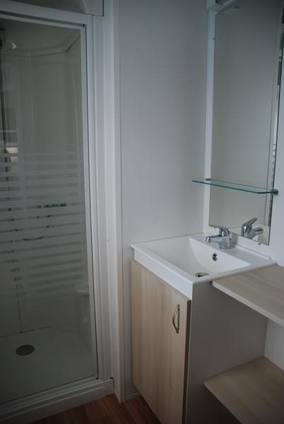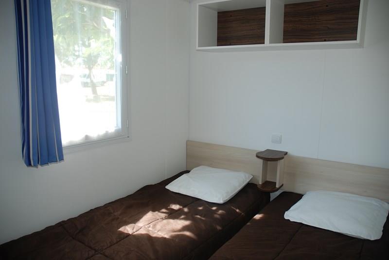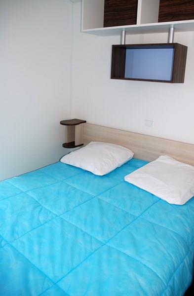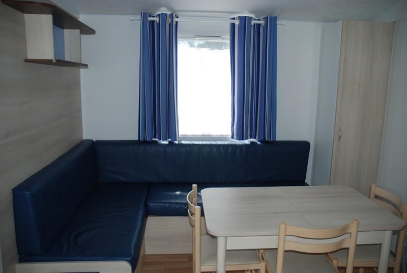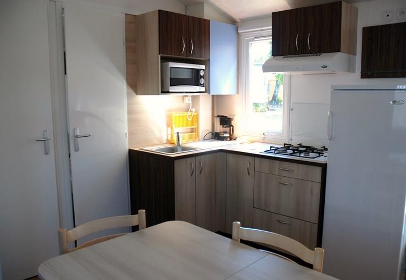 Mobil-home récent comprenant une chambre avec 1 lit 2 personnes, 2 chambres avec 2 lits 1 personne, banquette en L dans le salon, une salle de bains avec lavabo et douche, WC séparé, une cuisine équipée avec grand réfrigérateur/congélateur, micro-ondes, cafetière électrique, TV, une terrasse couverte avec salon de jardin.