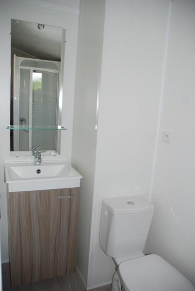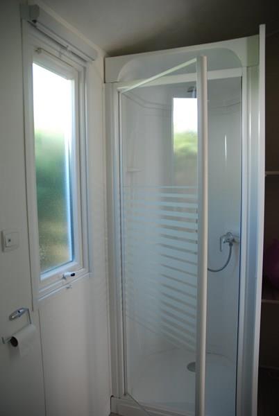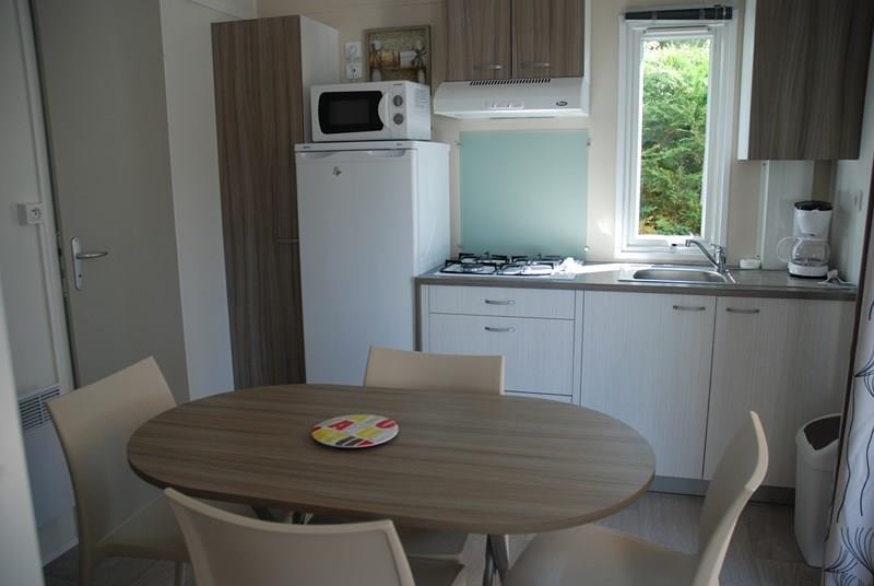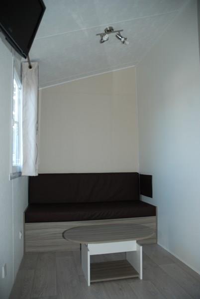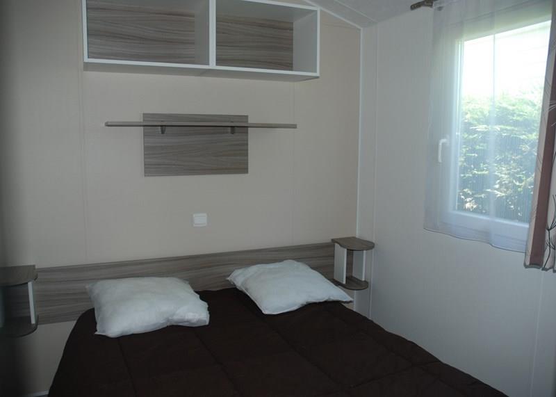 Mobil-home récent comprenant une chambre lit double, un espace salon avec banquette convertible 1 couchage, table basse et TV, un espace repas avec cuisine équipée, grand réfrigérateur/congélateur, SDB avec lavabo, douche et WC, terrasse couverte avec table et fauteuils, transat.