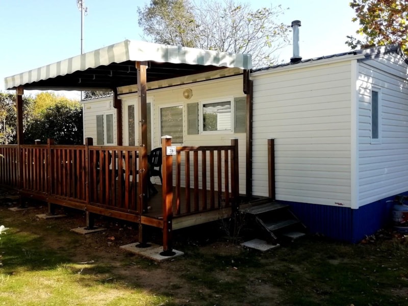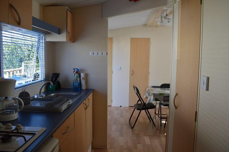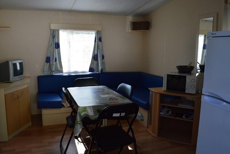 Mobil-home de +10 ans rénové en 2014, comprend une chambre avec 1 lit 2 personnes, une chambre avec 2 lits 1 personne, une salle de bains avec un lavabo et douche, WC séparé, une cuisine équipée avec grand réfrigérateur/congélateur, micro-ondes, cafetière électrique, TV, une terrasse bois couverte avec salon de jardin