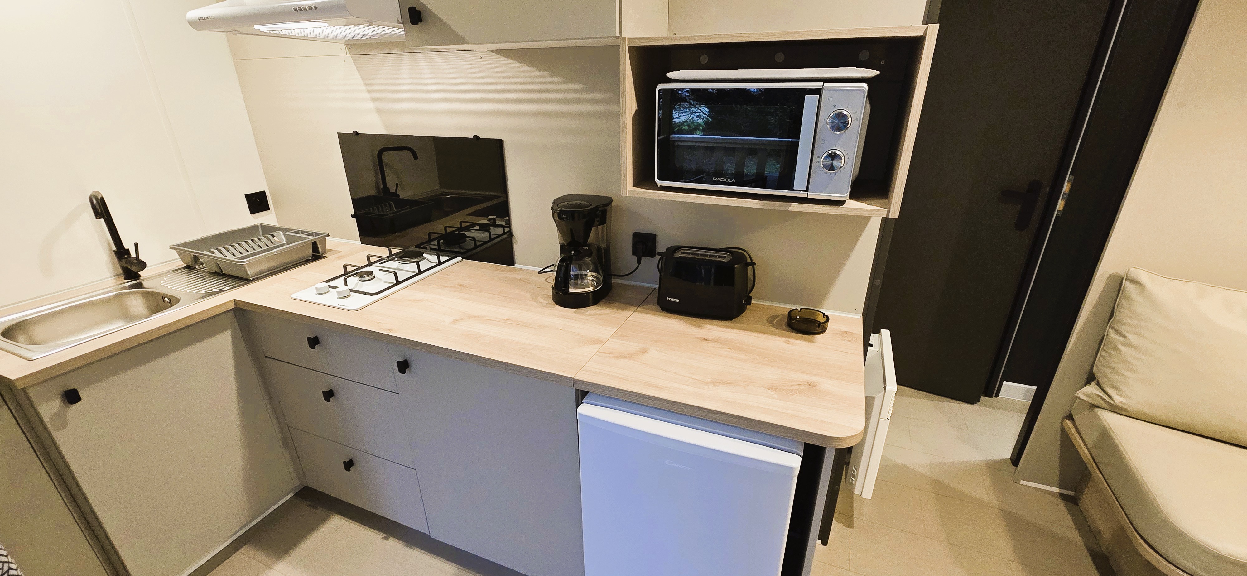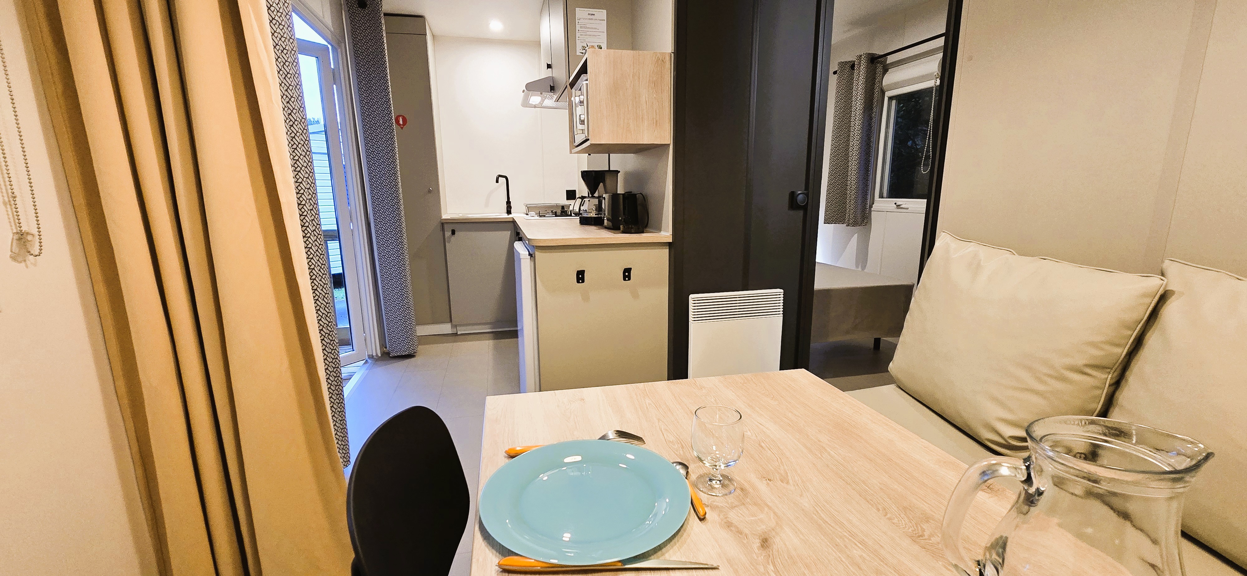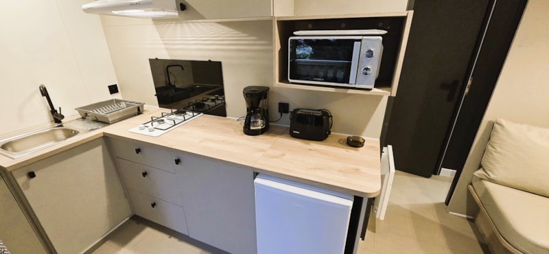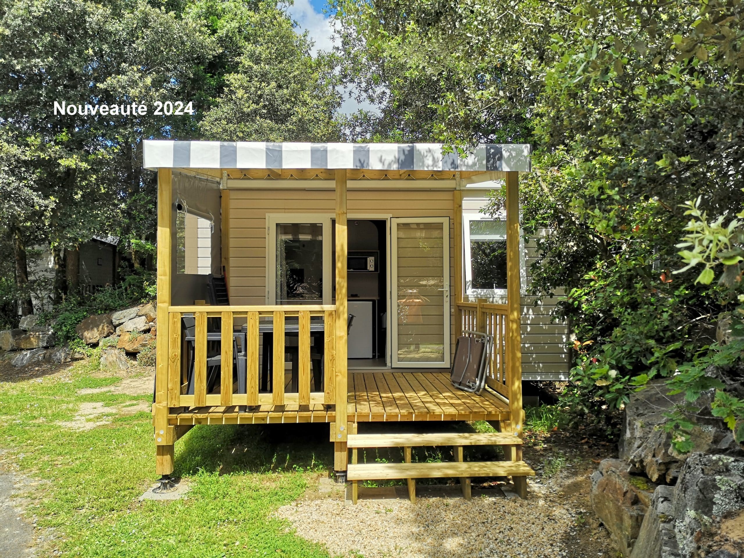 comprenant une chambre lit double, un espace de vie avec banquette convertible 1 couchage, table et cuisine équipée avec réfrigérateur/congélateur, TV avec réception satellite, SDB avec lavabo, douche et WC, terrasse couverte avec table et fauteuils, transat.