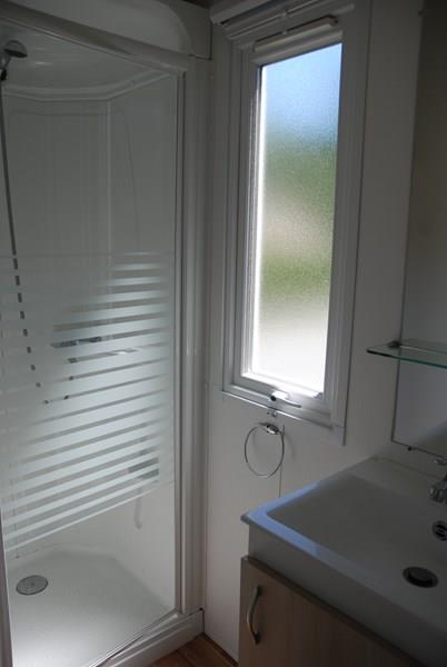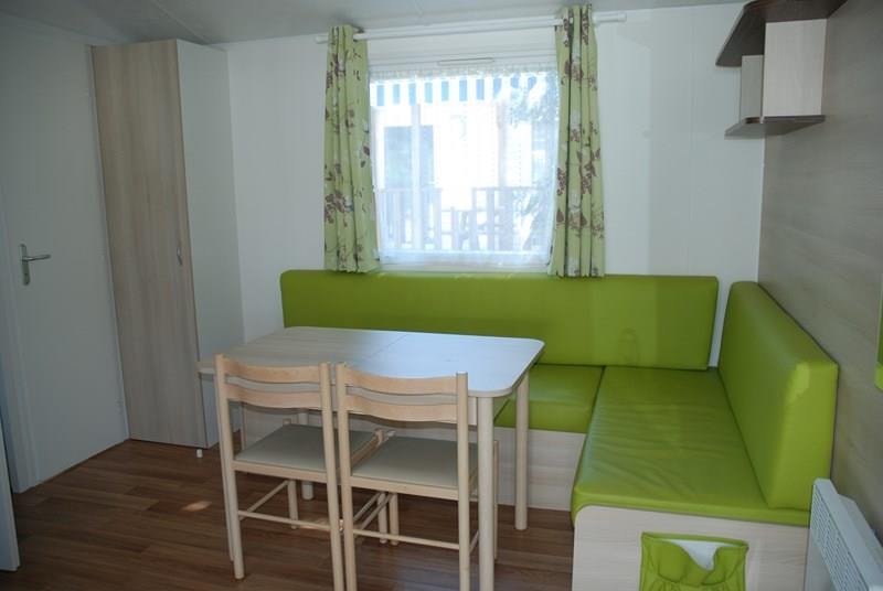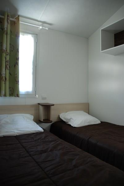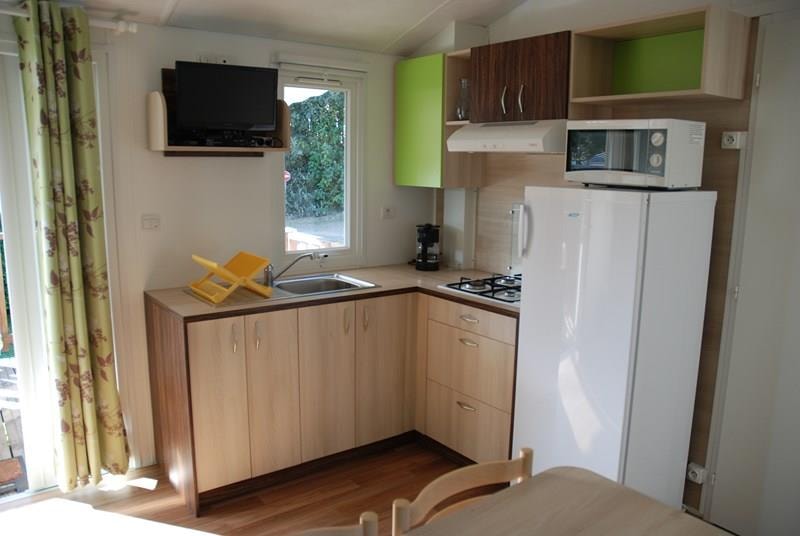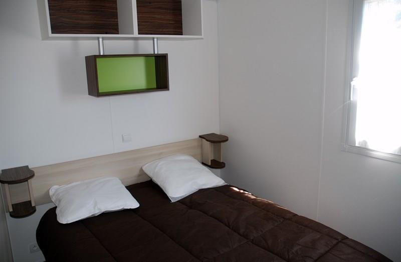 Mobil-home récent comprenant une chambre avec 1 lit 2 personnes et emplacement lit bébé, une chambre avec 2 lits 1 personne, un couchage convertible 2 personnes dans le salon, une salle de bains avec lavabo et douche, WC séparé, une cuisine équipée avec grand réfrigérateur/congélateur, micro-ondes, cafetière électrique, TV, une terrasse couverte avec salon de jardin.
