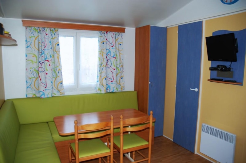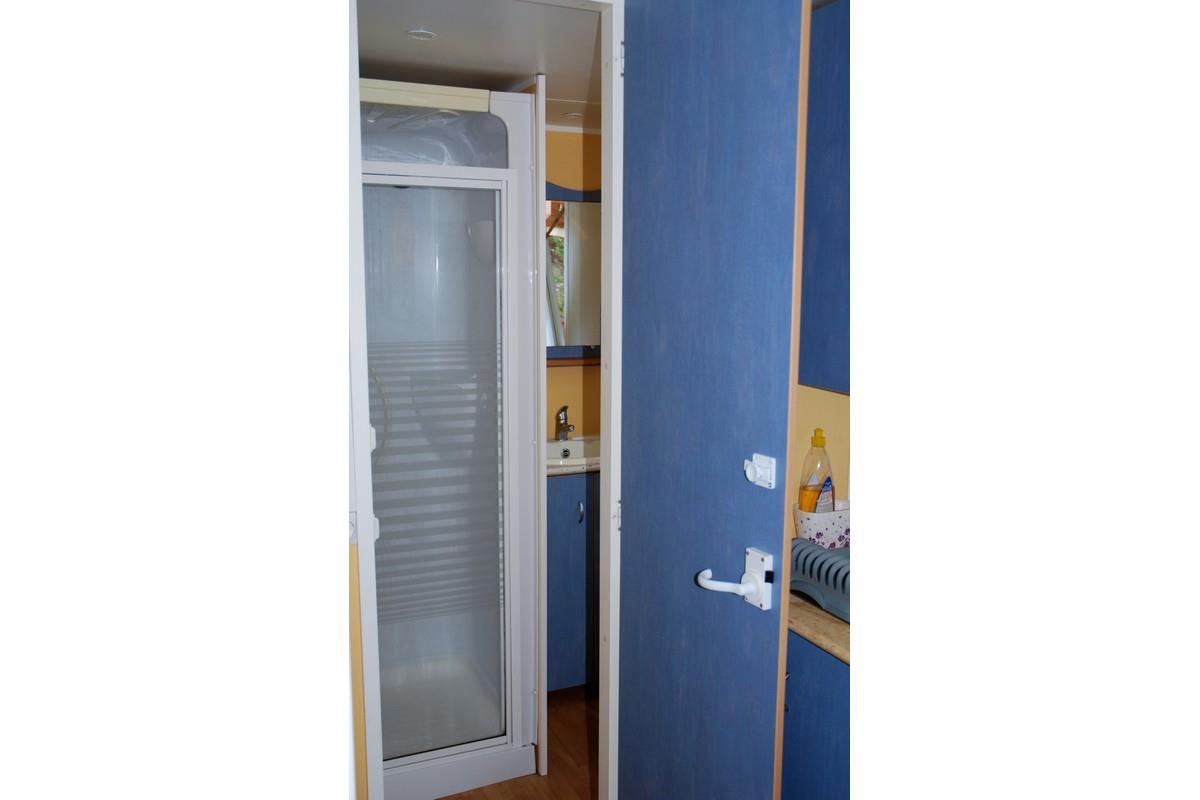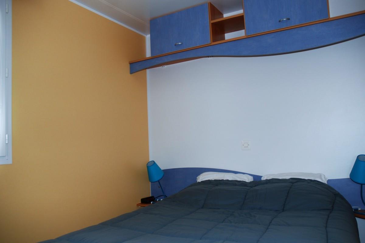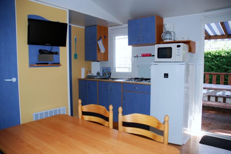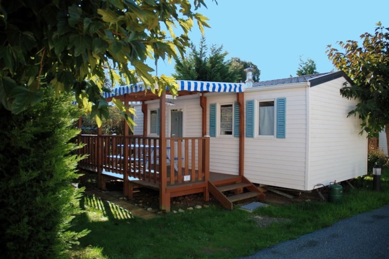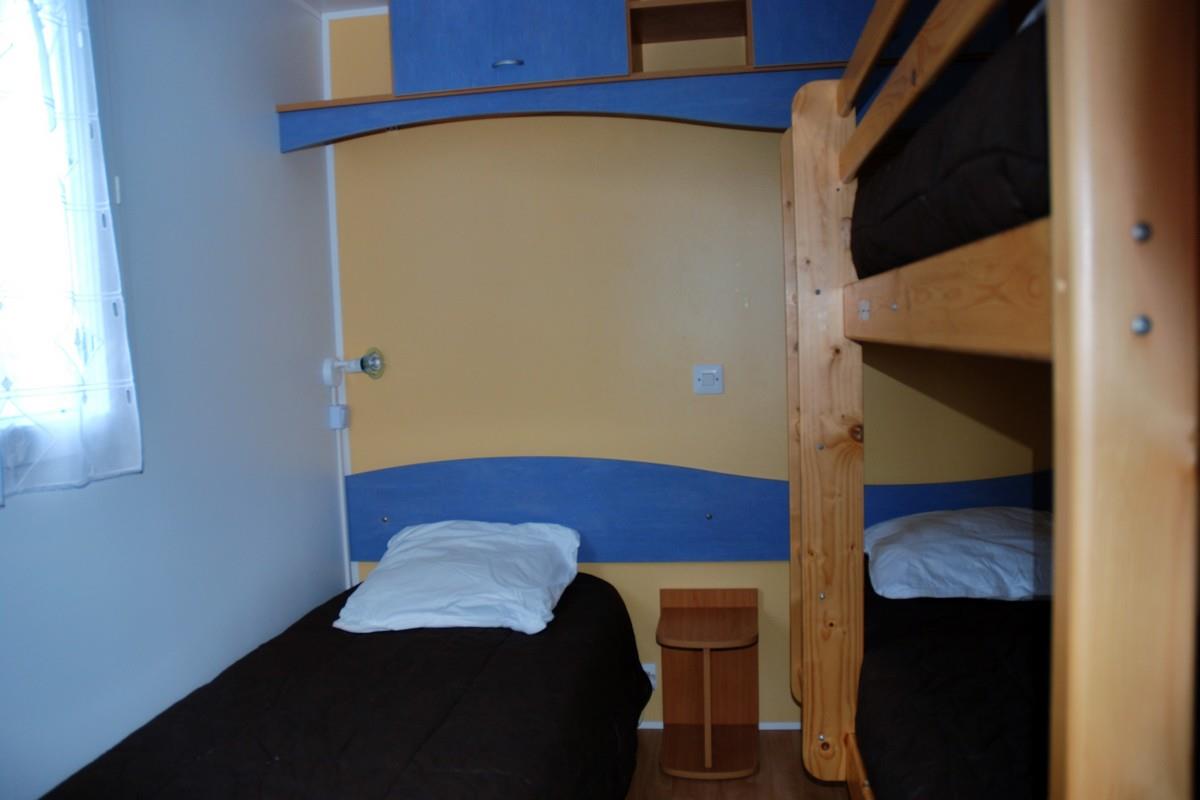 Mobil-home comprenant une chambre avec 1 lit 2 personnes, une chambre avec 3 lits simples dont 1 superposé, une salle de bains avec lavabo et douche, WC séparé, une cuisine équipée avec réfrigérateur/congélateur, micro-ondes, cafetière électrique, TV, une terrasse couverte avec salon de jardin.