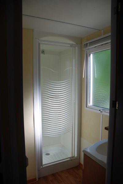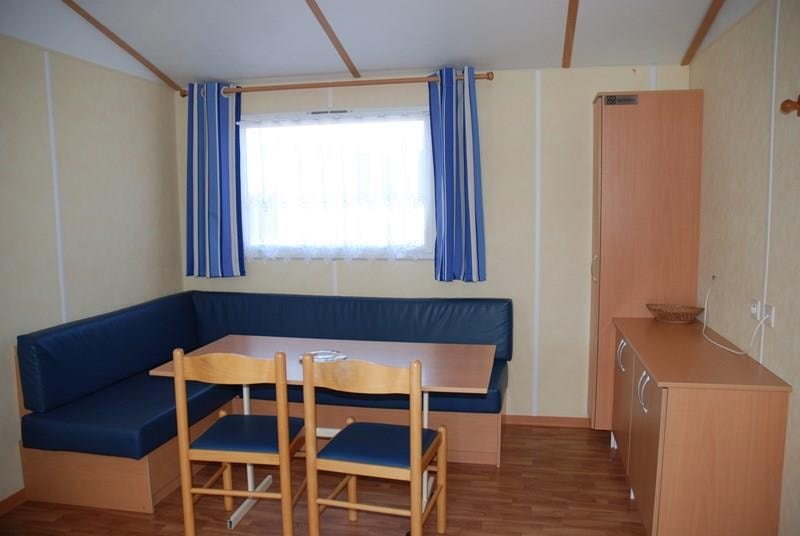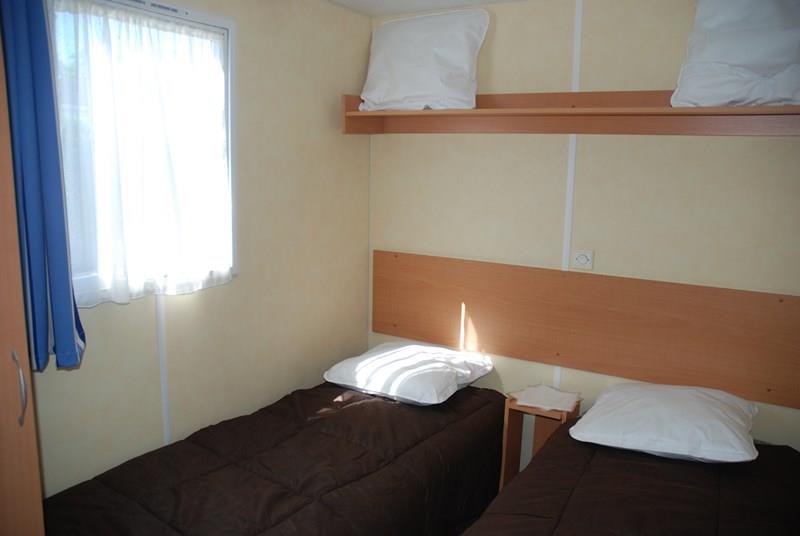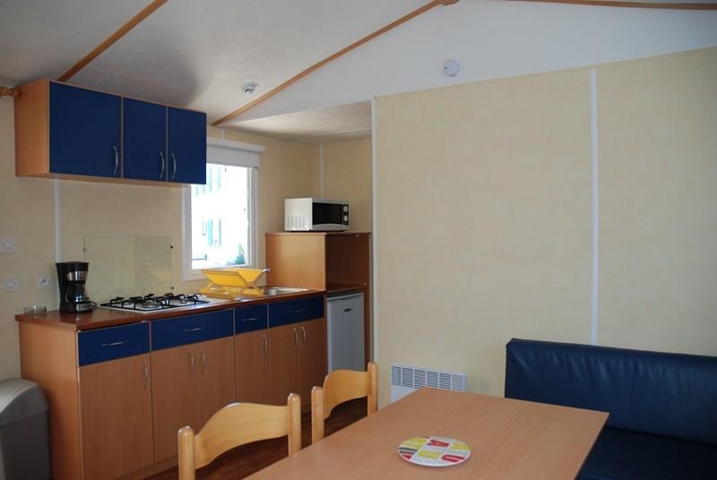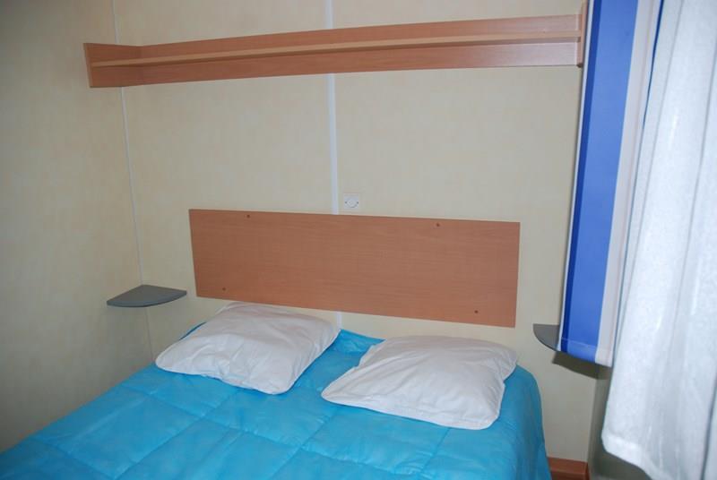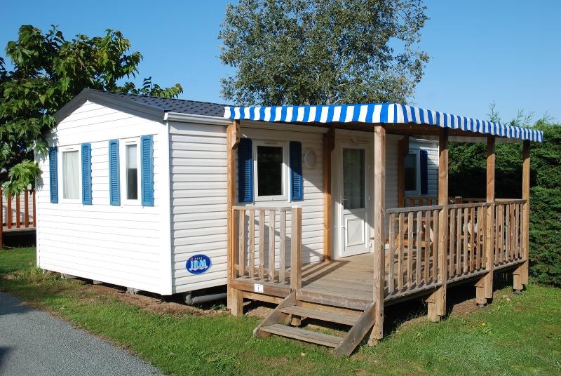 Mobil-home comprenant une chambre avec 1 lit 2 personnes, une chambre avec 2 lits 1 personne, un couchage convertible 2 personnes dans le salon, une salle de bains avec lavabo et douche, WC séparé, une cuisine équipée avec réfrigérateur/congélateur, micro-ondes, cafetière électrique, TV, une terrasse couverte avec salon de jardin.