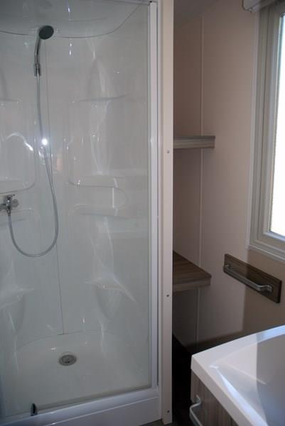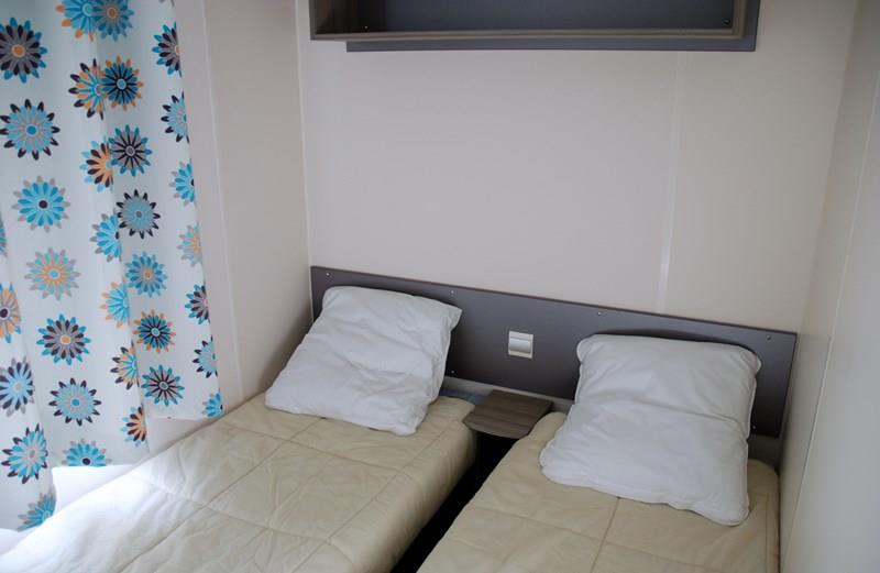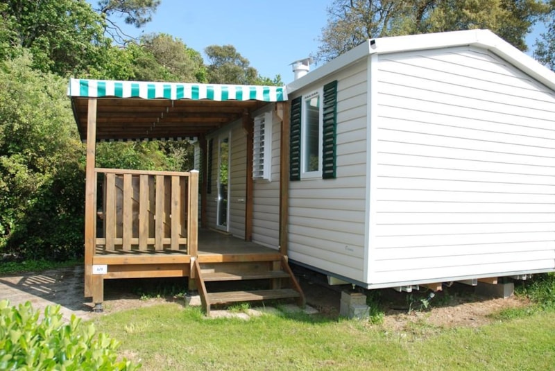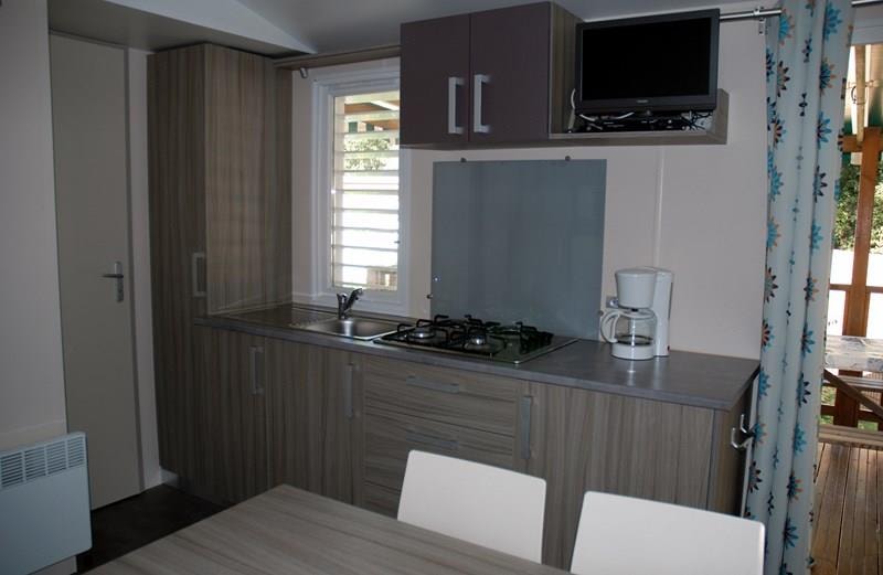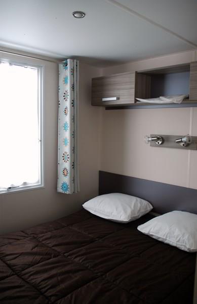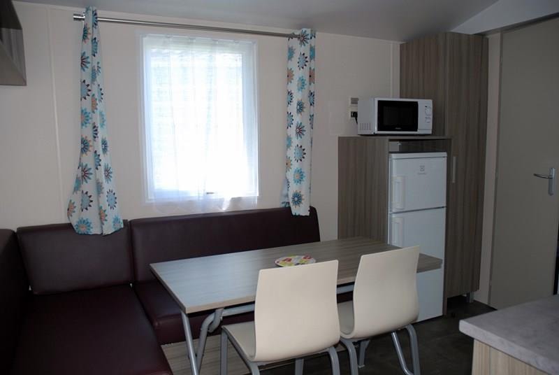 Mobile-home récent comprenant une chambre avec 1 lit 2 personnes, une chambre avec 2 lits 1 personne, une salle de bains avec lavabo et douche, WC séparé, une cuisine équipée avec réfrigérateur/congélateur, micro-ondes, cafetière électrique, TV, une terrasse couverte avec salon de jardin.